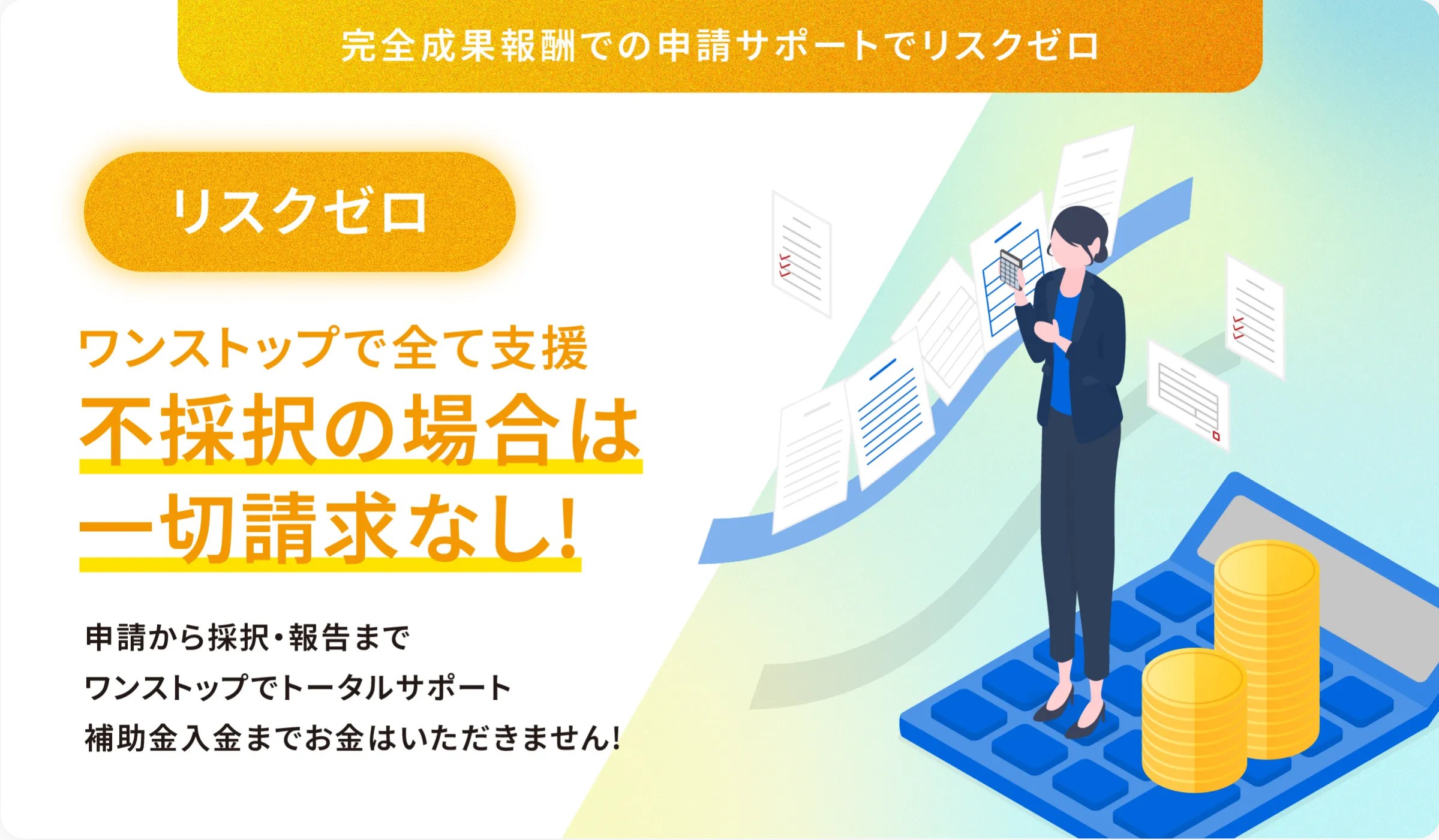申請サポート補助金ダイレクトでは、ご利用いただく事業者様の申請サポートにおいて、着手金や書類作成費用などの費用を一切いただいておりません。補助金が採択され、事業や報告業務が完了し、実際に入金されてから予め決められた手数料をお支払いいただく完全成果報酬型のサービスのため、不採択になった場合のリスクをカットできます。数年間にわたる報告義務がある場合も責任を持って最後まで対応いたしますのでご安心ください。