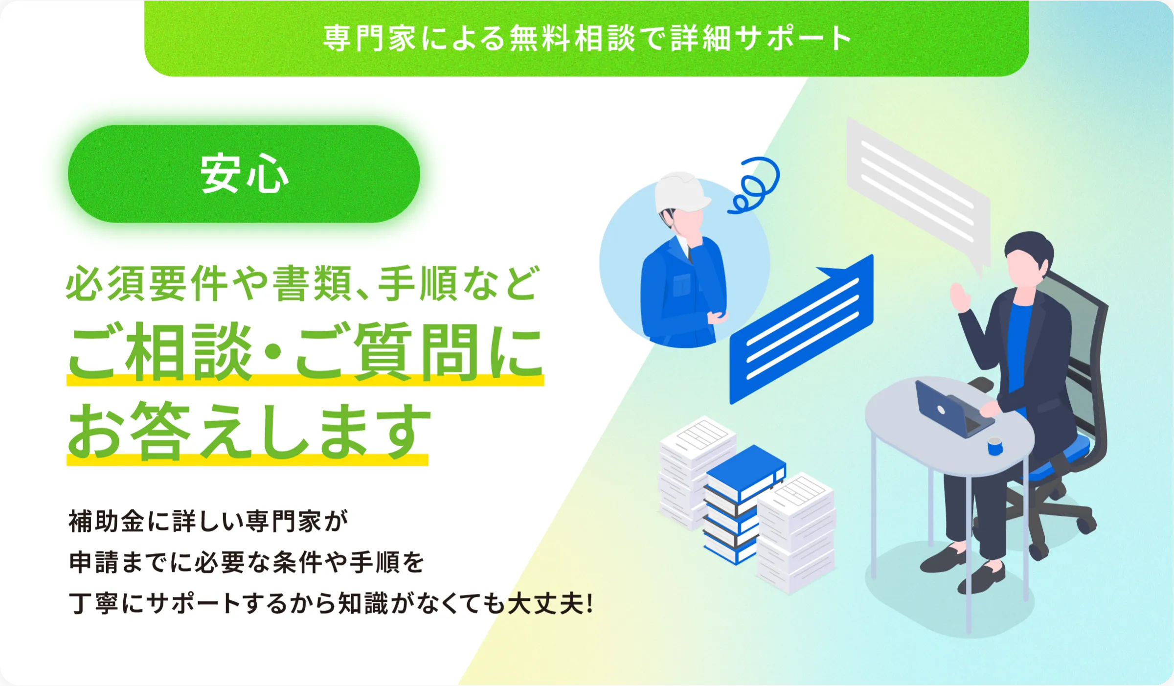 詳細サポート補助金ダイレクトでは、補助金に特化した専門のサポートチームが無料相談を承っております。御社が利用できる補助金の詳細情報や、申請するにあたっての必要書類や手順、プラスアルファで利用できるものやもっと最適な補助金のご提案まで、わかりやすくご案内いたします。